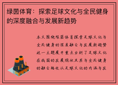本文围绕“绿茵体育:探索足球文化与全民健身的深度融合与发展新趋势”这一主题展开,重点分析了足球文化在我国的发展现状及其与全民健身的融合路径。从足球文化的内涵与发展、足球与全民健身的深度融合、足球教育与青少年培养体系的建设、以及政策支持与社会各界的参与等四个方面,探讨了足球与健身结合所带来的社会影响及未来趋势。文章通过分析当前的社会需求与发展趋势,提出了足球文化在促进全民健身方面的潜力和挑战,展示了体育产业在我国社会发展中的重要地位。最终,通过对各方面内容的总结,提出了未来我国足球文化与全民健身融合的方向和策略。